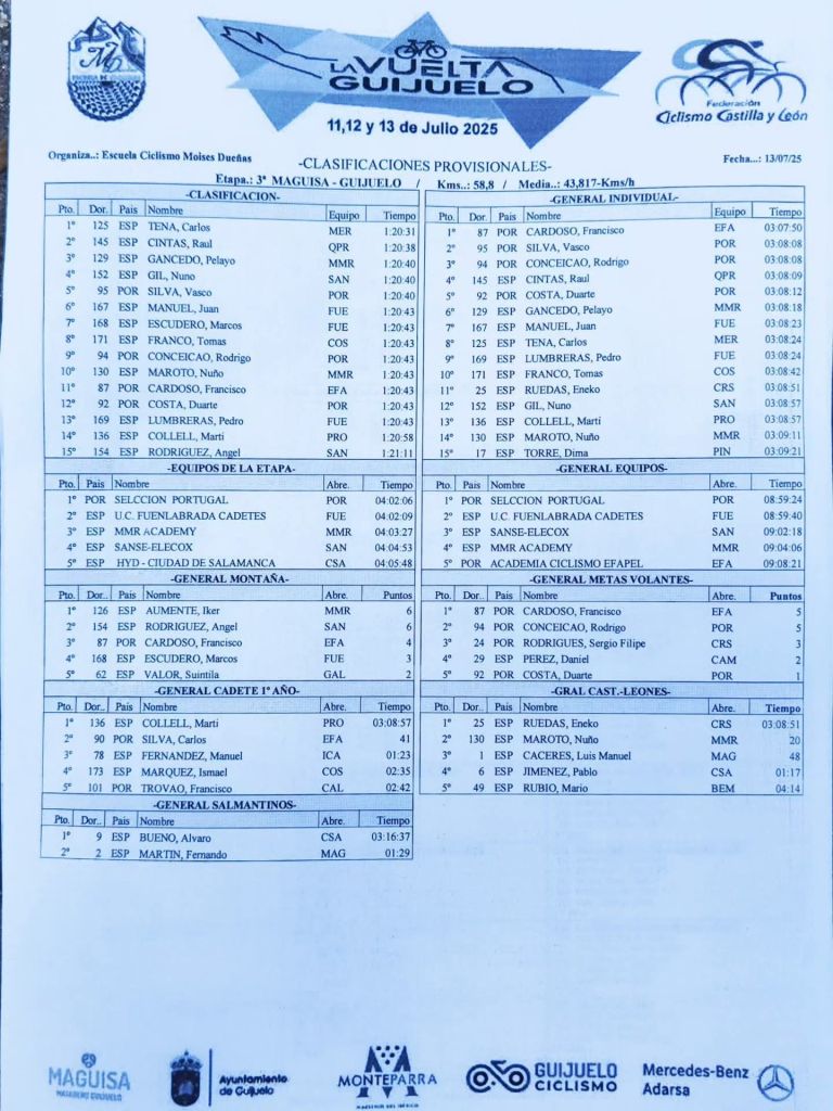 Victoria de Carlos Tena (Mérida Patrimonio Fernando Torres ProBikes) en la última jornada de la Vuelta a Guijuelo Cadete. Raúl Cintas (Quintana Proingo) termina segundo y Pelayo Gancedo (MMR Academy), tercero. Francisco Cardoso (Academia Efapel) se ha llevado la General.