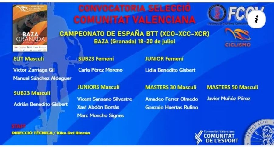 La Federació de Ciclisme de la Comunitat Valenciana y el seleccionador de BTT Kiko del Rincón, hacen pública la convocatoria de los ciclistas que conformarán la Selección de la Comunitat Valenciana en el Campeonato de España BTT XCO, XCC y XCR. El Nacional se celebrará en Baza (Granada) del 18 al 20 de julio.