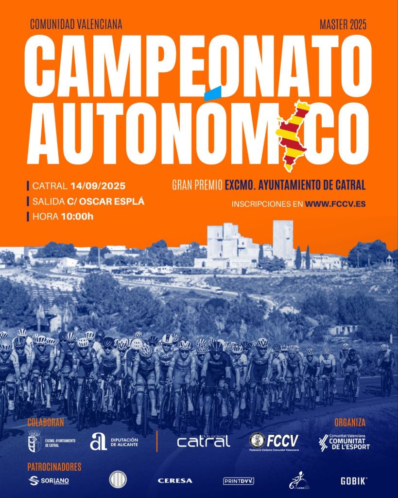 La localidad de Catral acogerá el Campeonato Autonómico de ciclismo Máster 2025. Será el domingo, 14 de septiembre y contará con un trazado espectacular que llevará al pelotón a recorrer la casi la totalidad de la Vega Baja, poniendo en valor los valores de la comarca y ofreciendo un auténtico espectáculo ciclista a una zona de abundante afición. El Club Ciclista Catral Telfy será el organizador de la competición que comenzará a las 10 horas.