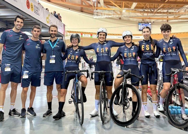 El conjunto de persecución por equipos femenino júnior ha dejado hoy un nuevo récord de España, el tercero de estos campeonatos para el equipo nacional dirigido por Juan Peralta. Por la mañana Leyre Almena, Leyre Toledo, Izaro Etxarri y Vera Valero lo han rozado de nuevo como ya hicieran ayer al parar el reloj en 4:41.700, emplazándose por la tarde a la lucha por el bronce frente a Alemania. Las teutonas se han mostrado ya en sesión vespertina superiores a las españolas, obteniendo la 3ª posición, pero el equipo nacional, esta vez con la inclusión de Noa Jiménez en lugar de Vera Valero, ha conseguido rebajar la anterior plusmarca nacional (4:41.106 en Luoyang, China), dejándola ahora en 4:39.506.
