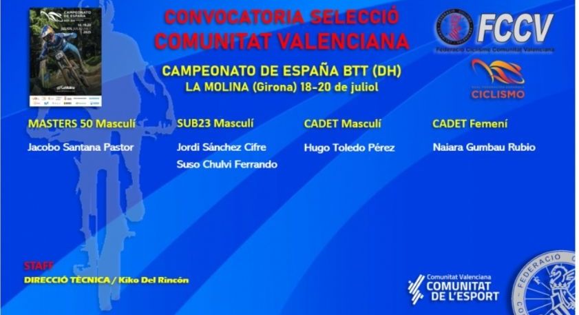 La Federació de Ciclisme de la Comunitat Valenciana y el seleccionador de BTT Kiko del Rincón, han hecho pública la convocatoria de los deportistas que conformarán la Selección de la Comunitat Valenciana en el Campeonato de España de Descenso (DH). Este campeonato se celebrará en La Molina (Girona) del 18 al 20 de julio.