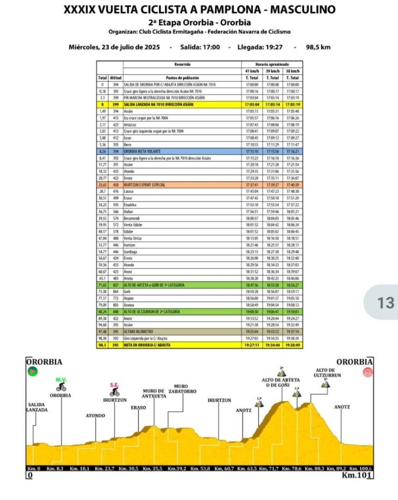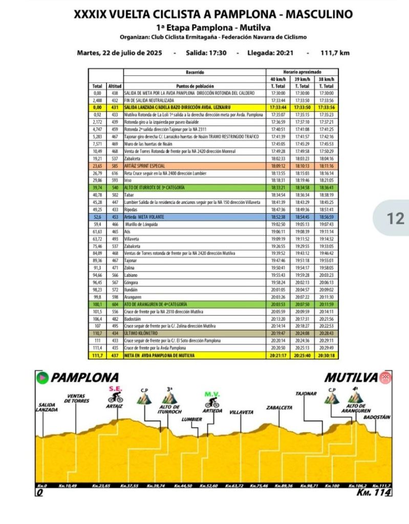 La Vuelta a Pamplona masculina comienza el martes 22 de julio. En su 39º aniversario cuenta con 4 días de intenso pedaleo que concluirán el día 25 en Caballo Blanco de la capital navarra. En la primera jornada, el pelotón deberá recorrer 111,7 kilómetros y superar los altos de Iturrotx y Aranguren, finalizando el día en Mutilva. La segunda jornada, aunque goza de menos kilómetros (98’5), tendrá el gran desafío del alto de Arteta o de Goñi, catalogado como de 1ª categoría, y el alto de Ultzurrun, de 2ª categoría.