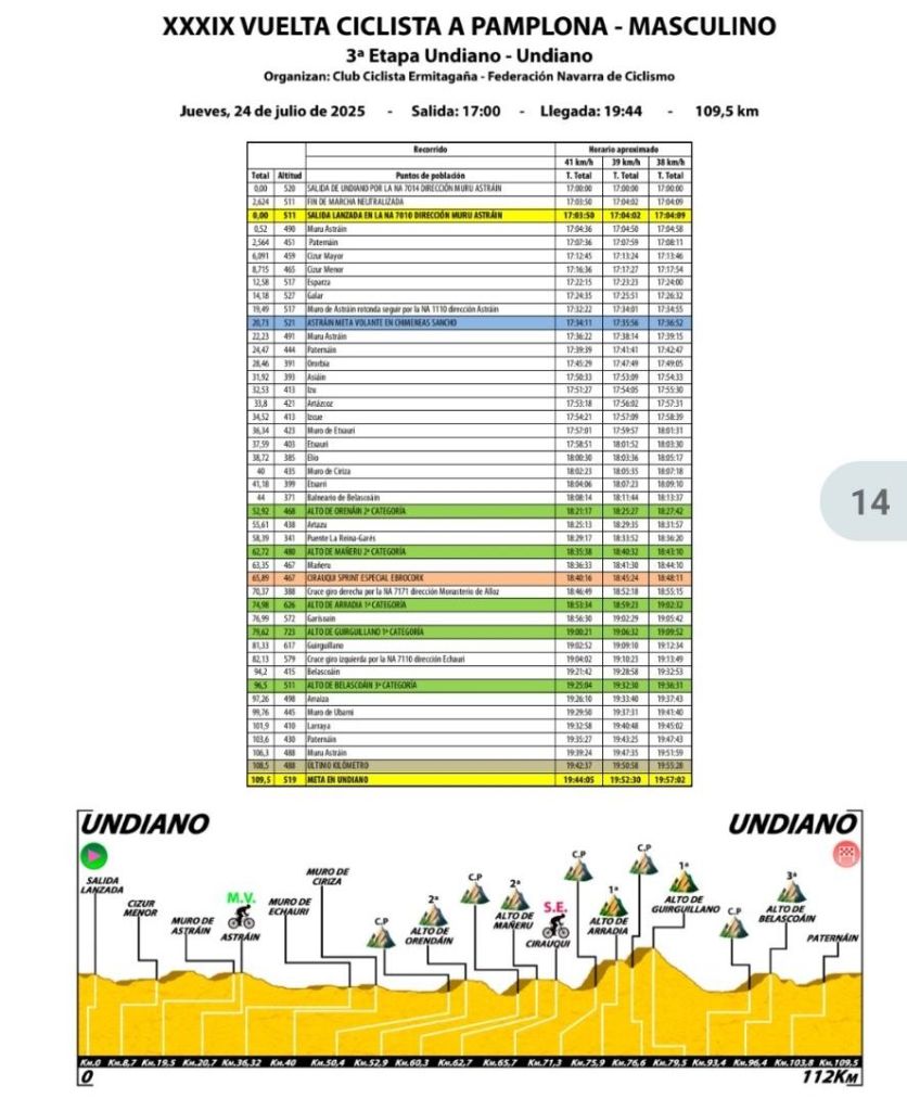 Para el 3º día, y tras encadenar los altos de Orenain, Mañeru, Arradia, Guirgullano y Belascoain, el pelotón logrará superar los 109’5 kilómetros, concluyendo en Undiano, mismo lugar de salida, y dispondrá todo para la etapa final. Salvando los altos de Orenain y Orendainz la prueba de 105,8 kilómetros presentará una disposición con poca subida y bajada, todo lo contrario que la jornada anterior, y será la ocasión perfecta para que los equipos apuren sus esfuerzos.