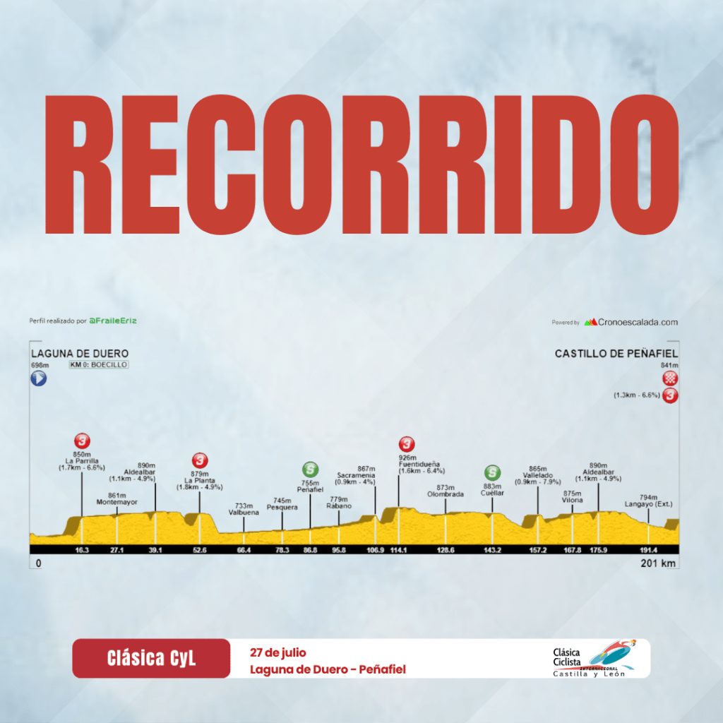 Tras realizar el descenso, visitarán Olombrada para, posteriormente, seguir el recorrido hasta el segundo esprint intermedio ubicado en Cuéllar en el kilómetro 143. Y en los últimos 50 kilómetros, encadenarán una serie de repechos y carreteras sinuosas cruzando por Vallelado, Viloria, Aldealbar (segunda paso) y Langayo para finalizar la carrera con un final explosivo en alto en el mítico y referencial Castillo de Peñafiel, que vivirá el desenlace de la Clásica Castilla y León 2025 repleto de aficionados agolpados en la vallas de las rampas que rodean al monumento.
