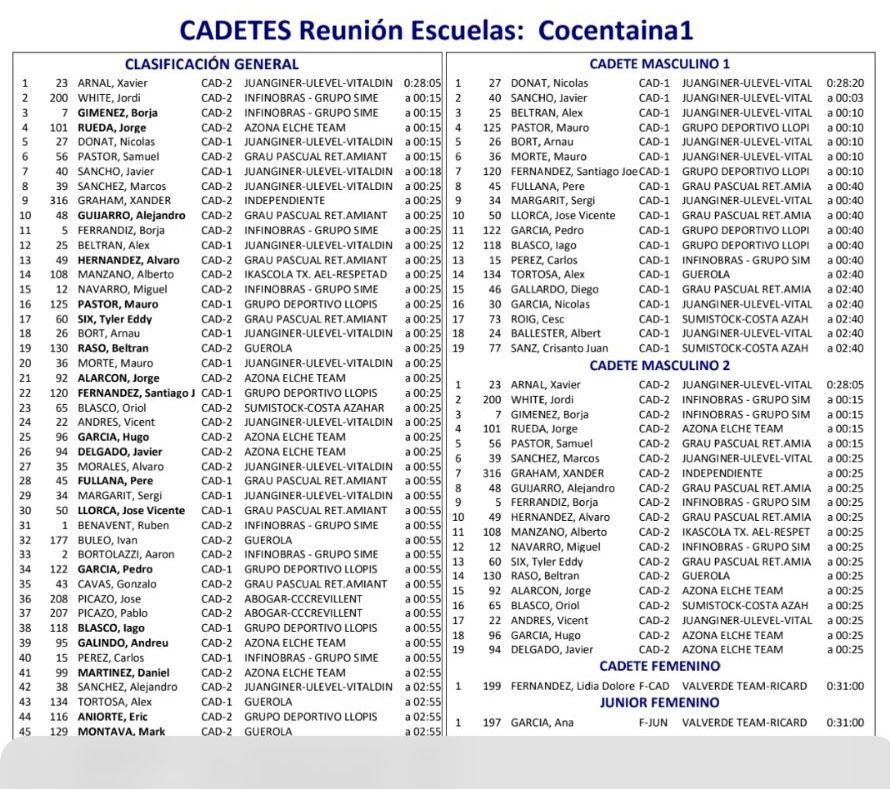 Xavi Arnal (Juanginer-Ulevel Vitaldinsport) se ha impuesto en solitario en Cocentaina en el 53 Trofeo San Hipólito para corredores Cadetes. Jordi White (Infinobras Grupo Sime) ha sido segundo y su compañero de equipo, Borja Giménez, tercero.