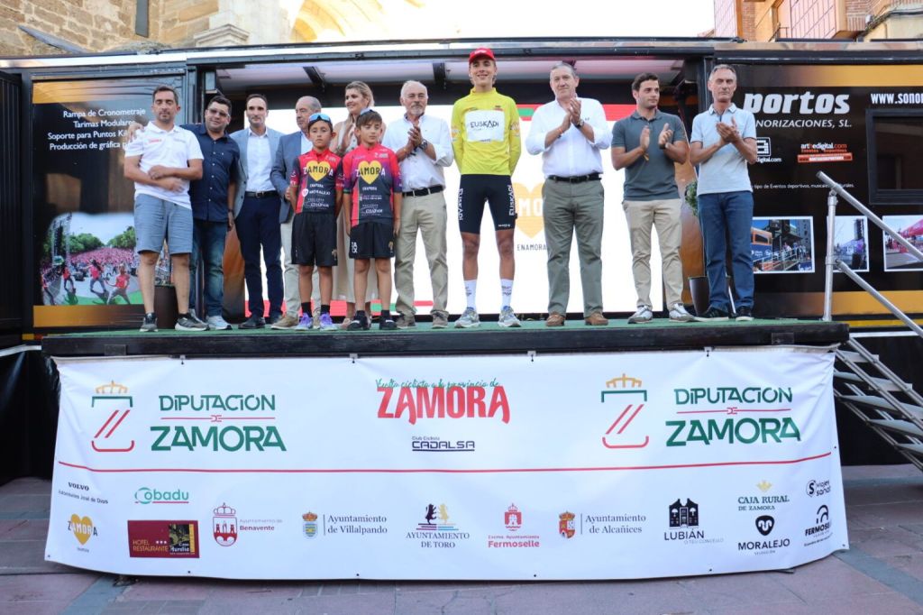 Gari Ugarte se viste con todos los maillots de la carrera: el amarillo que patrocina la Diputación de Zamora y viste al líder de la general; el azul que patrocina Viajes Sanabria y corresponde a la clasificación de la regularidad; el verde que patrocina Caja Rural de Zamora y corresponde a las metas volantes; el blanco con lunares rojos que patrocina Restaurante Casa Aurelia y que corresponde al líder de la montaña; el maillot blanco que patrocina Cobadú y viste el líder de la combinada; y el maillot negro con los colores de la bandera de Zamora que corresponde al mejor sub-21.
