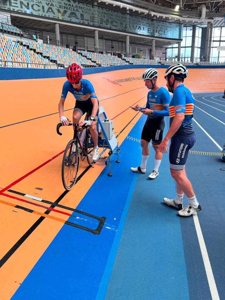 Vicent Perales: «Inicialmente hemos rodado para coger el truco a la pista. Luego, se han realizado salidas de bloque para practicar el Kilómetro. No ha faltado la Velocidad por equipos con Rosa, Mateu y Cruzeta e individualmente los 200 metros. Mañana tenemos intención de trabajar la Eliminación, que este año también se va a realizar en Paraciclismo, sin olvidar de nuevo la Velocidad por escuadras y el probar otros desarrollos».