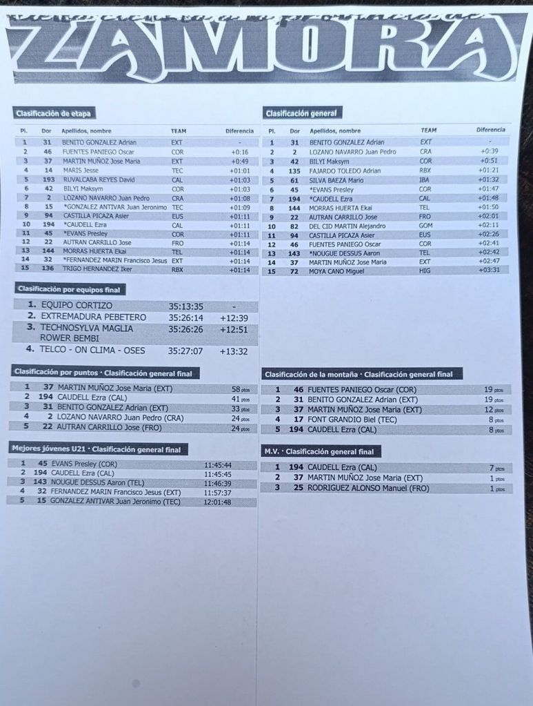 Los pupilos de Alfonso Rodríguez se vaciaban en el tramo final, viendo muy cerca la posibilidad de ganar etapa y llevarse la general con un Benito que iniciaba el día en séptima posición a 51 segundos del liderato de Geerlings. Finalmente, Martín lo daba todo en la aproximación al muro terrorífico de Lubián, donde Adrián sacaba su mejor versión para llegar a meta victorioso, eso sí, no perdiendo un instante en festejar ya que tras cruzar la línea de llegada ponía toda su atención en el cronómetro y el paso de esos segundos que pudieran otorgarle el triunfo final de la Vuelta a la Provincia de Zamora. No le iba a valer el apretón definitivo en el pelotón a ninguno de sus rivales, que llegaban tras Fuentes y Martín, segundo y tercero de la etapa respectivamente, cediendo más de un minuto, lo que sellaba la merecida corona zamorana de Adrián Benito.