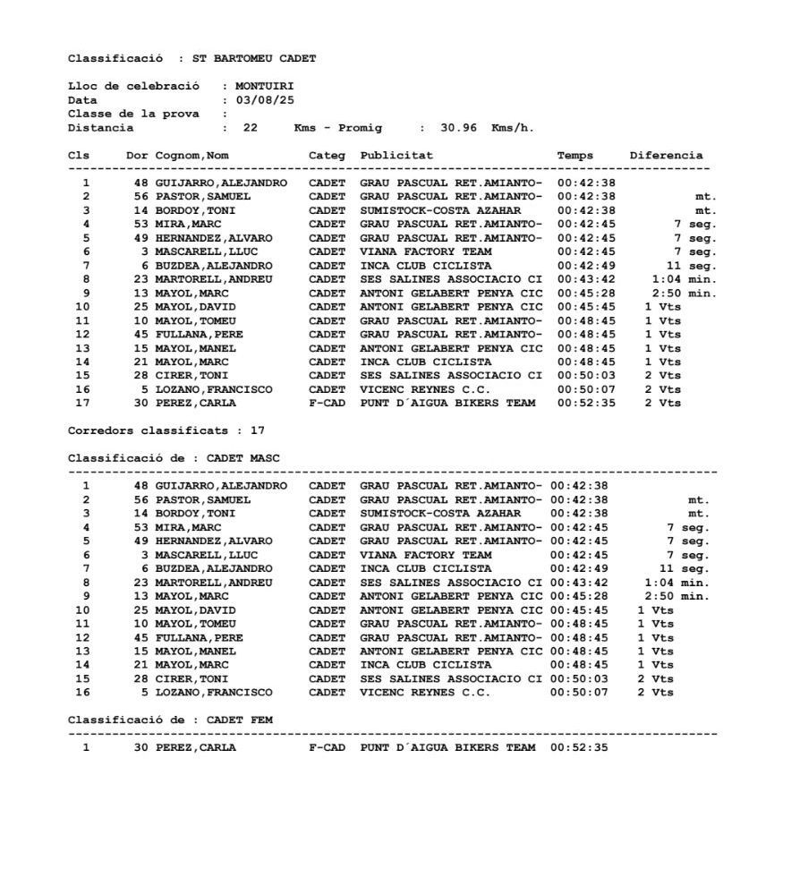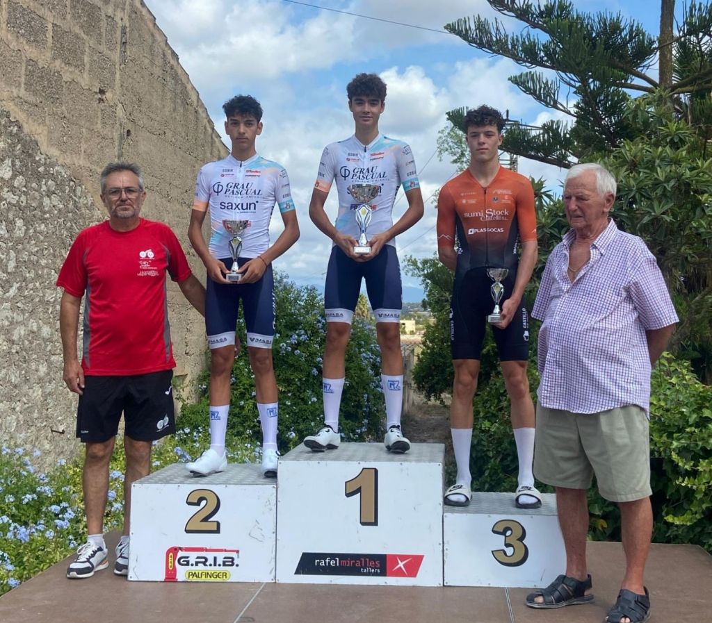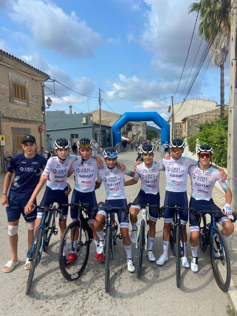 Exhibición del equipo cadete Grau Pascual Retirem Amianto Saxun en Montuiri. Alejandro Guijarro se ha impuesto esta mañana en la VII Cursa Ciclista Festes Sant Bartomeu. Samuel Pastor ha terminado segundo; Marc Mira, cuarto y Álvaro Hernández, quinto. Tercera plaza de Toni Bordoy (Sumistock-Costa Azahar).
