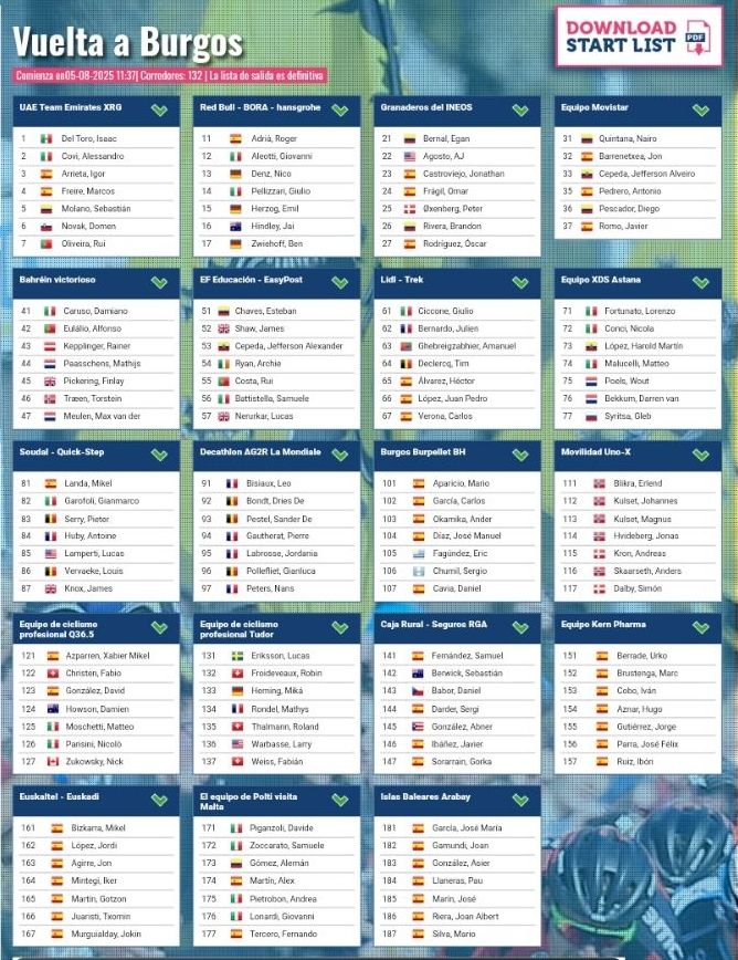 Pensando en la clasificación general, en la Vuelta a Burgos competirán ciclistas de la talla de Isaac del Toro, Egan Bernal, Juanpe López (que ha fichado por Movistar Team para 2026), Giulio Ciccone (que viene de ganar la Clásica de San Sebastián), Javier Romo, Nairo Quintana, Giulio Pellizzari, Damiano Caruso, Mikel Landa, Wout Poels, Lorenzo Fortunato, Urko Berrade, Jai Hindley, Harold Martín López o Davide Piganzoli, entre otros.