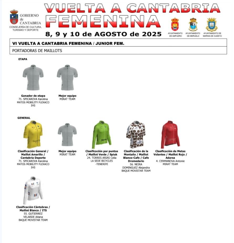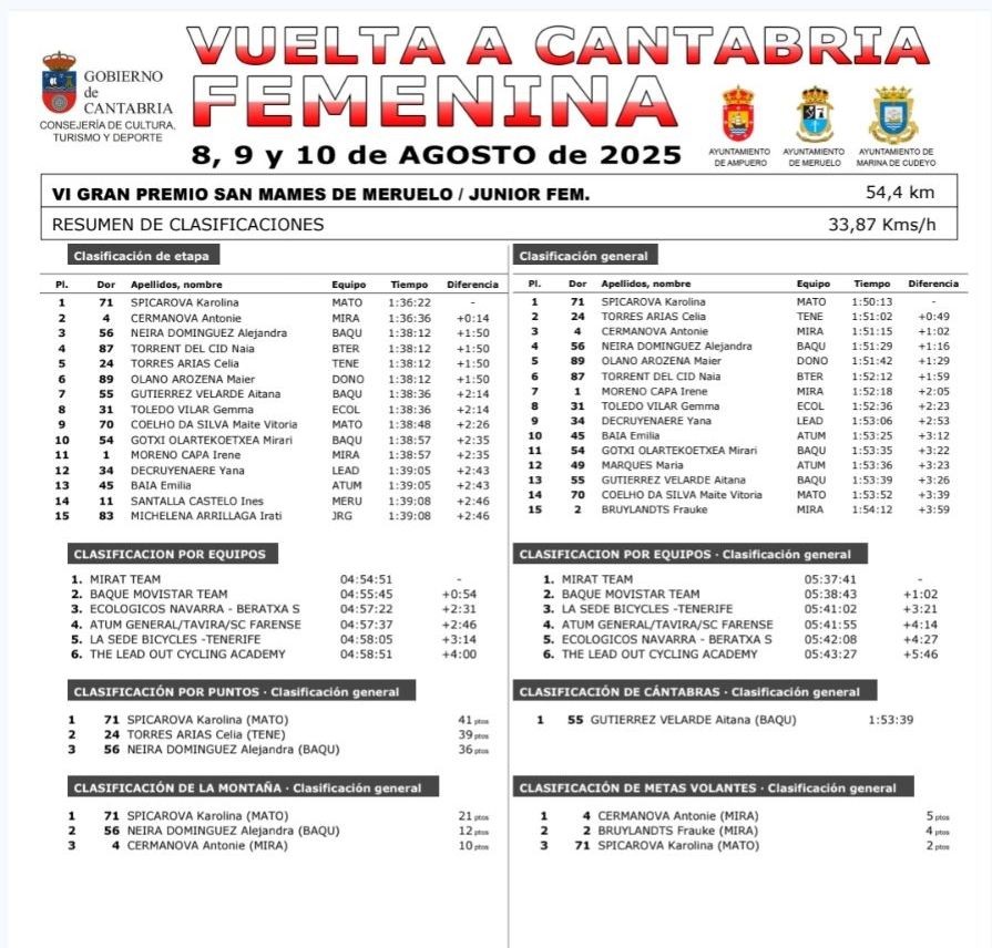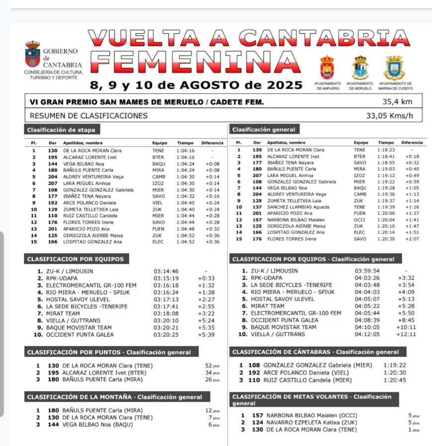 Clara de la Roca (Tenerife) se ha impuesto en el GP San Mamés de Meruelo, segunda etapa de la Vuelta a Cantabria Femenina. Carla Bañuls (Mirat) ha terminado cuarta y se ha vestido con el maillot de líder de la montaña. Nayara Ibáñez (Hostal Savoy Ulevel WTeam) termina octava y sigue tercera en la General, que lidera De la Roca. Bañuls es cuarta.
