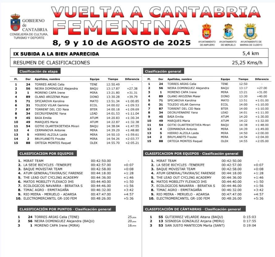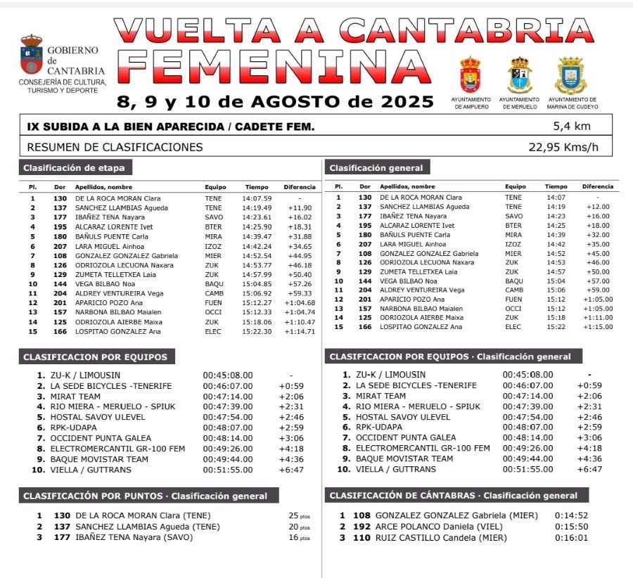 Nayara Ibáñez (Hostal Savoy Ulevel WTeam) fue tercera en Cadetes, y primera de primer año, en la etapa inicial de la Vuelta a Cantabria Femenina disputada el viernes. Quinta plaza de Carla Bañuls.