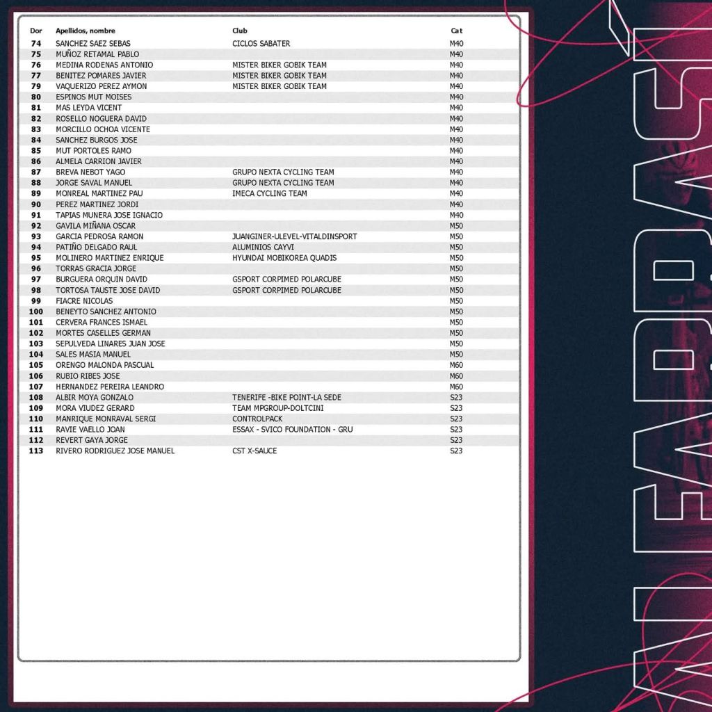 - Categorías: Sub-23 Fem., Sub-23, Master 60 fem., Master 60, Master 50 fem., Master 50, Master 40 fem., Master 40, Master 30 fem., Master 30, Junior fem., Junior, Elite fem., Elite