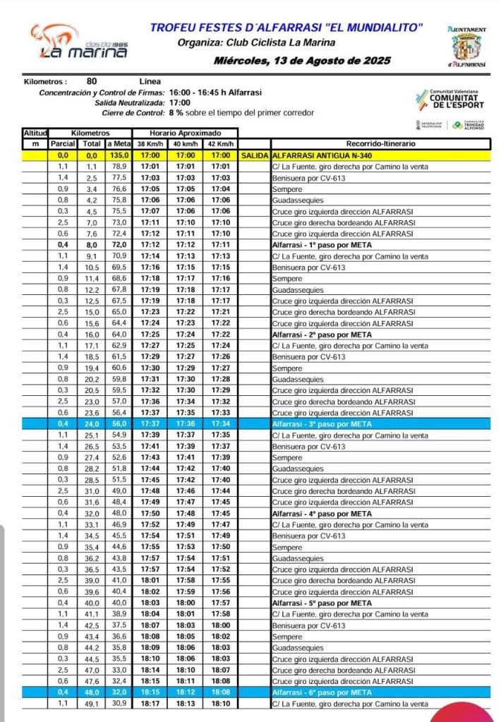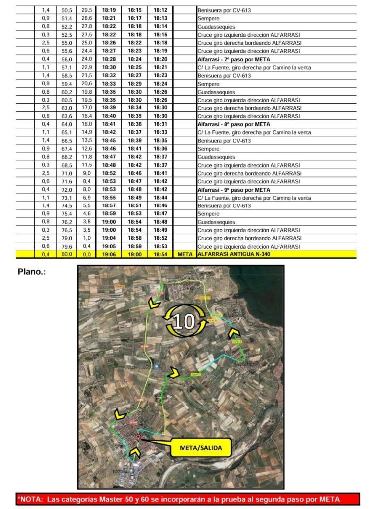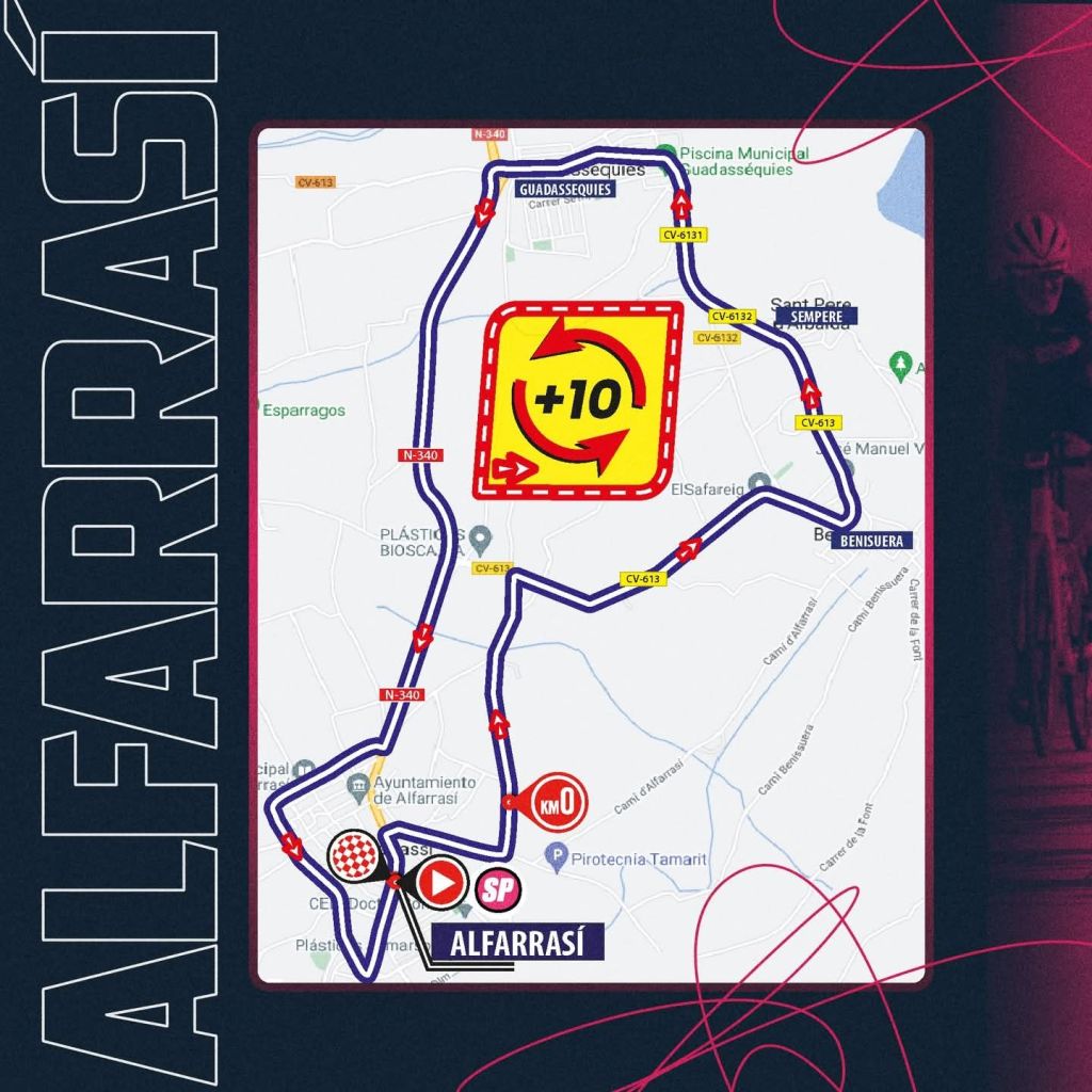 El recorrido de la prueba es de 80 kilómetros. Se darán 10 vueltas a un circuito que pasará por las localidades de Benissuera, Sempere, Guadasséquies, el Palomar, Albaida, Atzeneta d’Albaida, Montaverner y Alfarrasí.