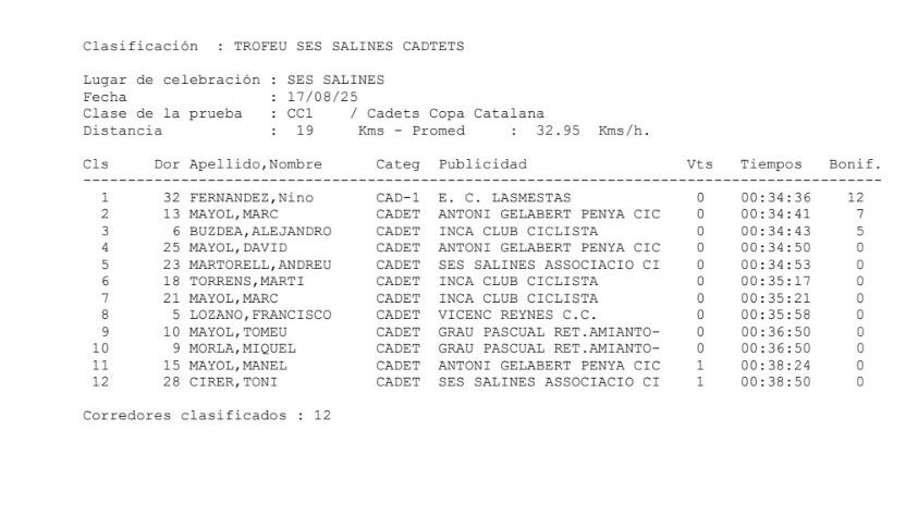En Cadetes, Nino Fernández (LasMestas) ha sido el ganador con Marc Mayol (Antoni Gelabert), segundo, y, Alejandro Buzdea (Inca), tercero.