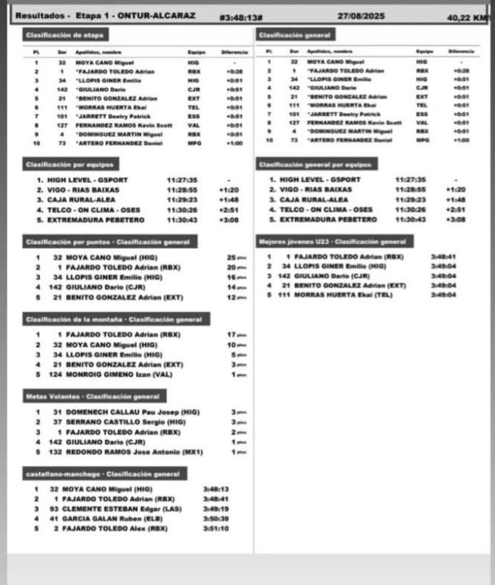 Miguel Moya (High Level Gsport) ha sido el ganador en solitario de la primera etapa de la I Vuelta Ciclista Castilla-La Mancha Leader que ha finalizado en Alcaraz y se ha vestido de líder. Adrián Fajardo (Rias Baixas) ha sido segundo a 28″, mientras que Emilio Llopis (High Level Gsport) ha encabezado el grupo perseguidor, a 51″. Pau Doménech (High Level Gsport) lidera las Metas Volantes y Fajardo la Montaña. AVANCE