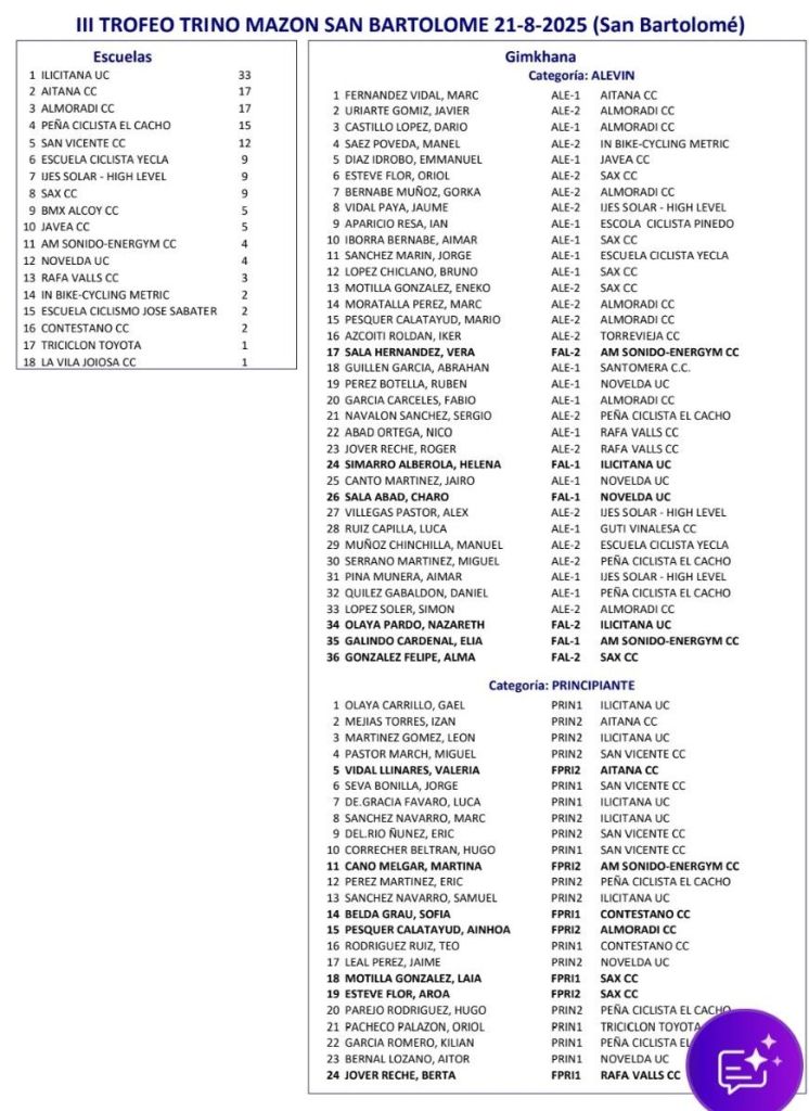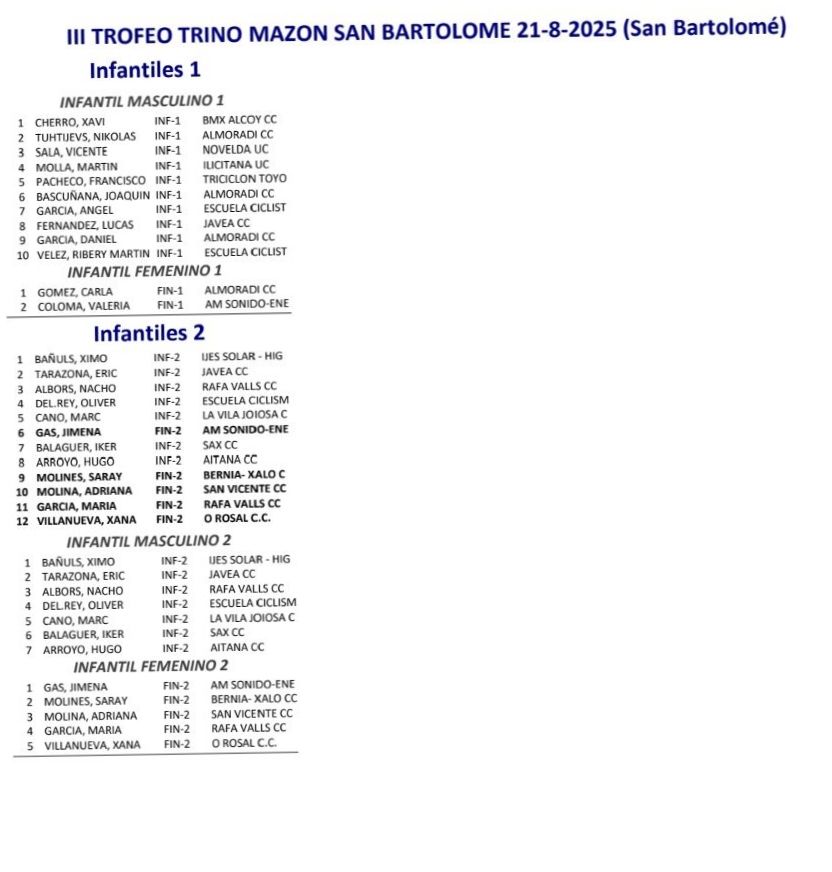 La Unión Ciclista Ilicitana se ha impuesto en el 𝗜𝗜𝗜 𝗧𝗿𝗼𝗳𝗲𝗼 𝗧𝗿𝗶𝗻𝗼 𝗠𝗮𝘇𝗼𝗻 de Escuelas disputado en 𝗦𝗮𝗻 𝗕𝗮𝗿𝘁𝗼𝗹𝗼𝗺é y puntuable para la Challenge de Alicante. Aitana y CC Almoradí han completado el podio de Escuelas.