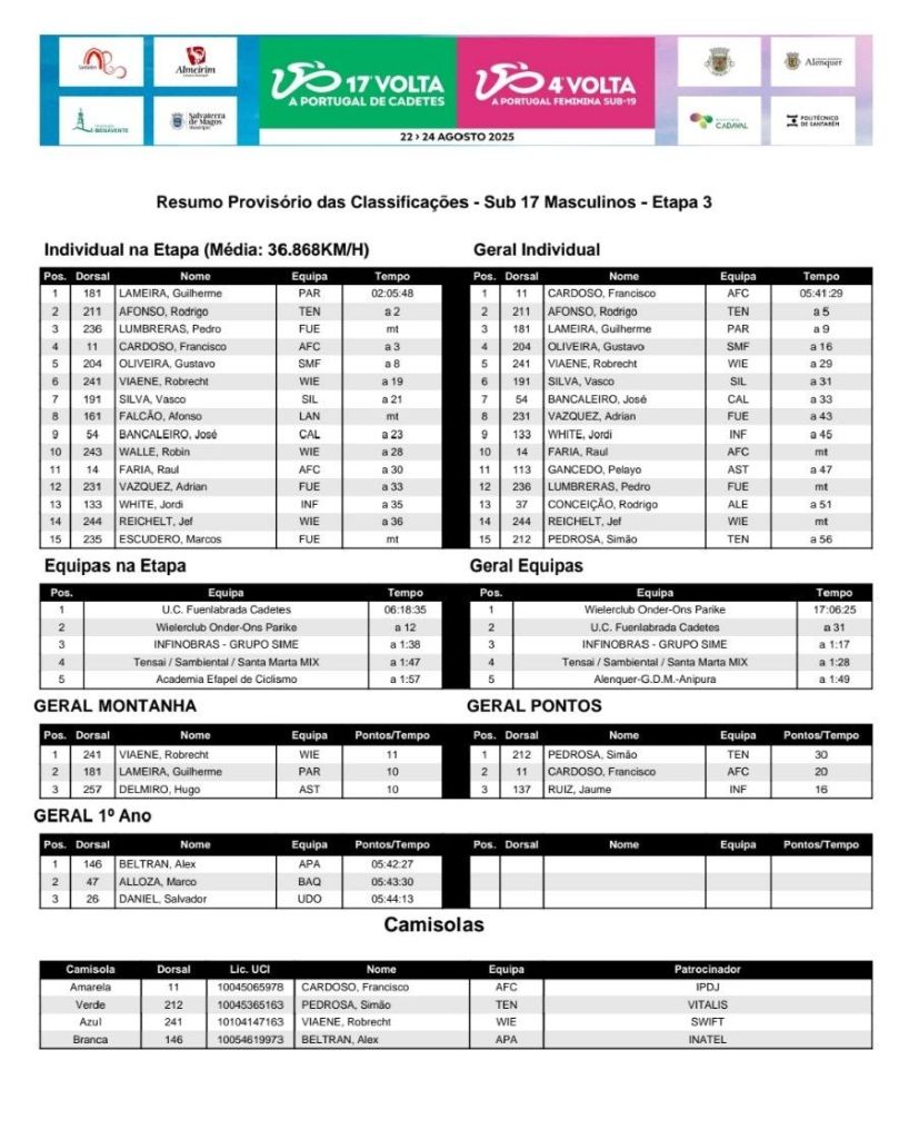 Francisco Cardoso ganó la 17.ª Volta a Portugal de Cadetes este domingo, tras finalizar cuarto en la meta en alto de Montejunto. El joven ciclista de Efapel Cycling quedó a tres segundos de Guilherme Lameira (Paredes/Reconco), ganador de la última etapa de la carrera.