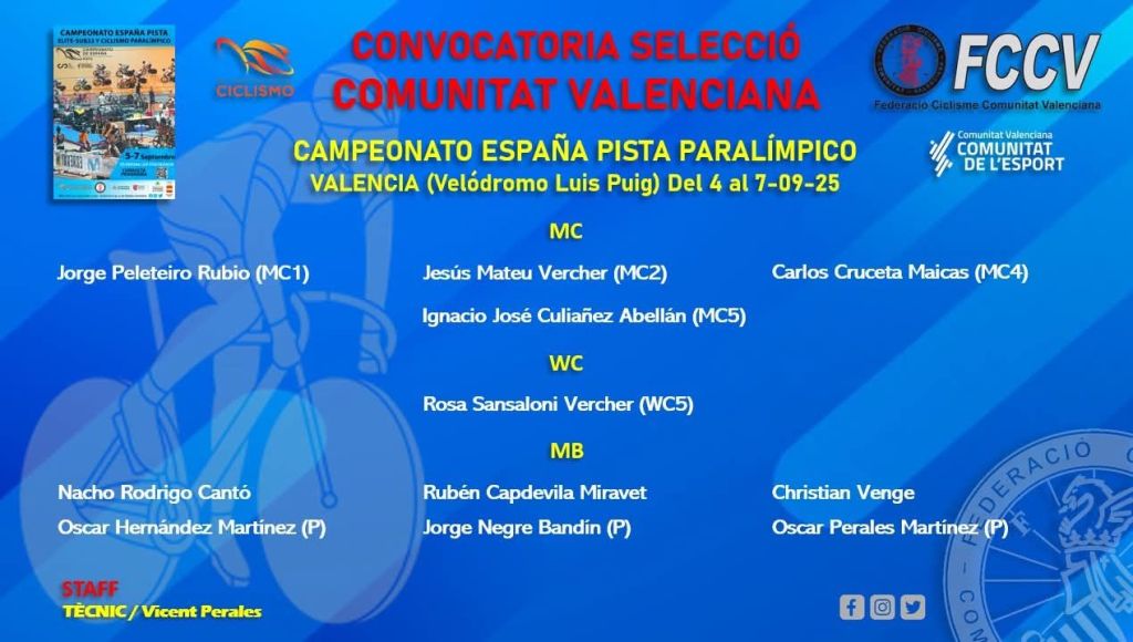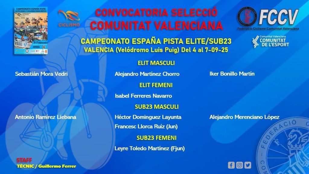 Los seleccionadores de la FCCV, Guillermo Ferrer y Vicent Perales, han hecho pública la convocatoria de los deportistas que formarán la Selección de la Comunitat Valenciana en el próximo Campeonato de España de Pista de las categorías Élite, Sub23 y Paraciclismo.
