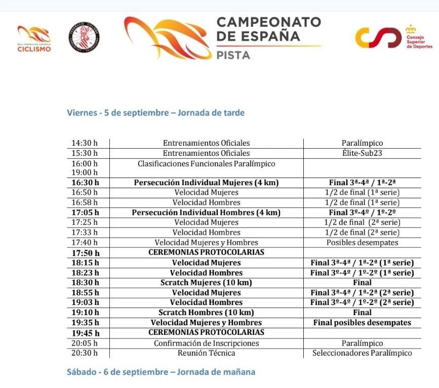 El programa de competición definitivo, mediante el que podréis conocer toda la distribución de pruebas, está disponible a través de este enlace para su consulta. Hoy viernes 5 de septiembre la acción comenzará a las 9:30 h y está previsto que finalice sobre las 20:00 h en un día en el únicamente competirán los/as ciclistas élite-sub23. En la maratoniana jornada del sábado, que se extenderá desde las 9:45 h hasta más allá de las 20:30 h, ya convivirán en el Lluis Puig las competiciones élite-sub23 con las paralímpicas; mientras que el domingo los últimos títulos élite-sub23 y paralímpico se disputarán entre las 8:30 h y las 15:45 h.