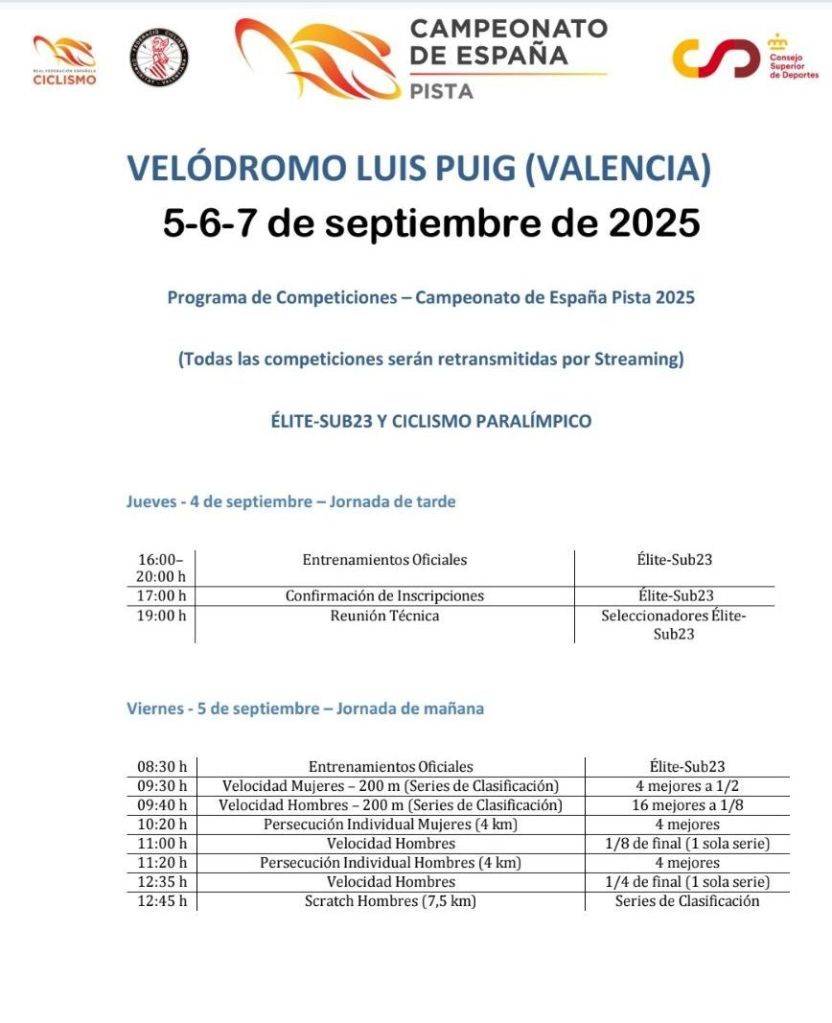 Además, toda la información al respecto del Campeonato de España de Pista Élite-Sub23 y de Ciclismo Paralímpico de Valencia, un nuevo evento de gran relevancia que tendrá lugar en la Comunitat de l’Esport, podréis encontrarla en redes sociales a través del hashtag #CEPistaValencia25. Esta edición 2025 del nacional de Pista se llevará a cabo a través del programa de ayudas a competiciones PAC_CV, impulsado por la Fundación Trinidad Alfonso de la mano del Comité Olímpico Español (COE).