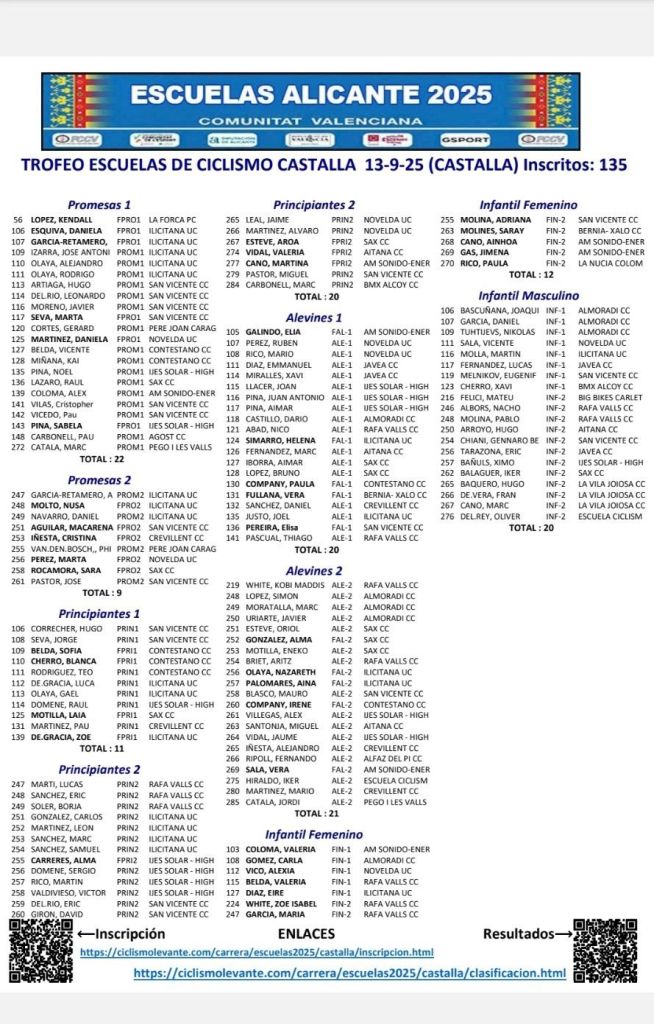 18/05 TROFEO ESCUELAS DE CICLISMO VILAJOIOSA. Clasificaciones
