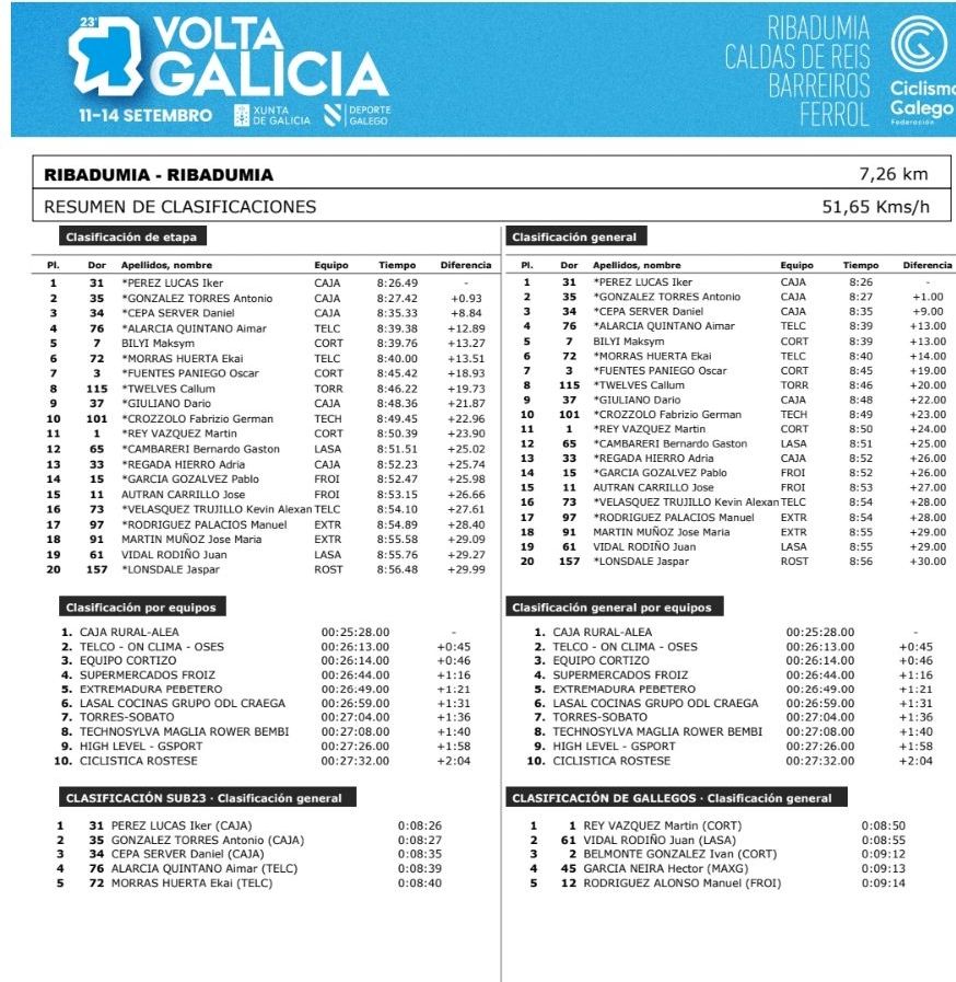 Iker Pérez (Filial Caja Rural Alea de) se ha impuesto en CRI de 7,2 kilómetros, que ha dado el banderazo de salida en Ribadumia a la Volta a Galicia. Sus compañeros de equipo Antonio González y Dani Cepa han completado el podio de la jornada.