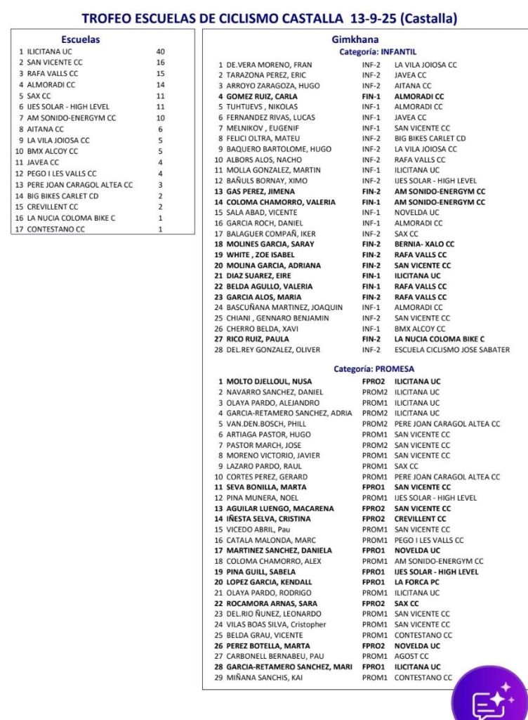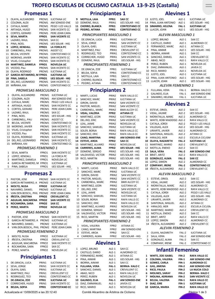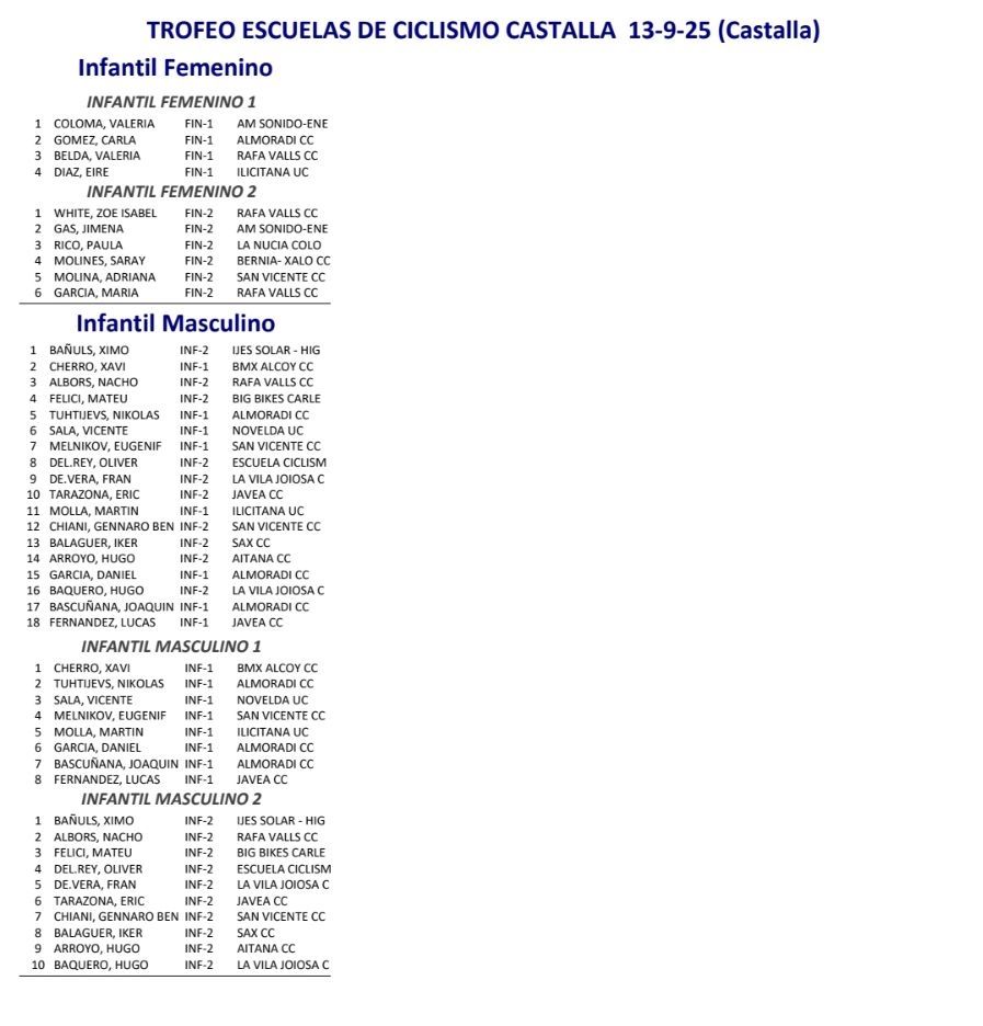 13/09 TROFEO ESCUELAS DE CICLISMO CASTALLA. Clasificaciones
