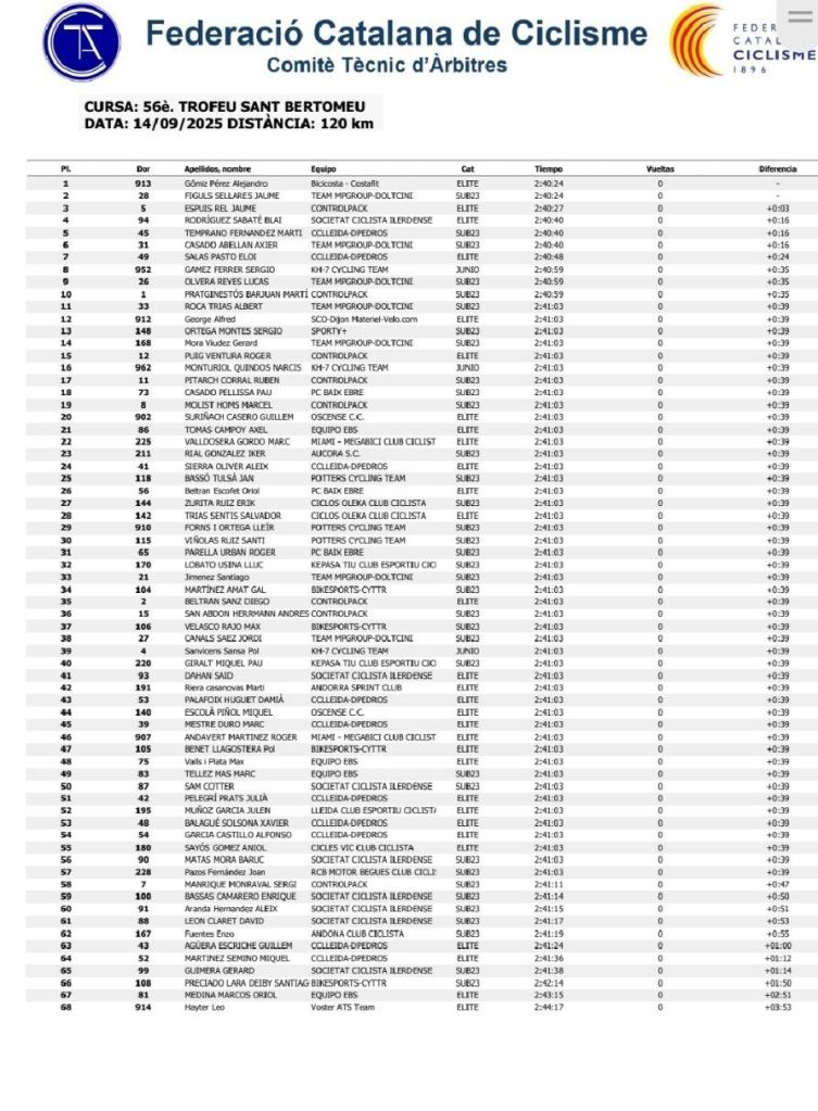 Las Grans Clàssiques-9º Trofeu Joan Casadevall seguirán lideradas por Guillem Suriñach (Huesca La Magia), hoy 20º en meta. Suriñach ha visto como sus principales rivales Eloi Salas (CC Lleida-DPedrós) y Albert Roca (Team MP Group) han conseguido reducir su ventaja y llegarán con opciones reales de hacerse con la general final en la última fecha que se disputará el próximo 4 de octubre con la 6ª Clàssica Modest Capell de Torregrossa.
