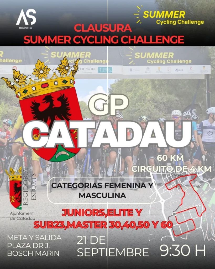 El domingo, 21 de septiembre, a partir de las 9.30 horas, el GP Catadau pone el telón a la Summer Cycling Challenge 2025. Espera un circuito de cuatro kilómetros rapidísimos, perfecto para rodar en pelotón y para que los más valientes busquen la escapada soñada. La salida y meta estarán situadas en la calle Dr. J. Bosch Marín.
