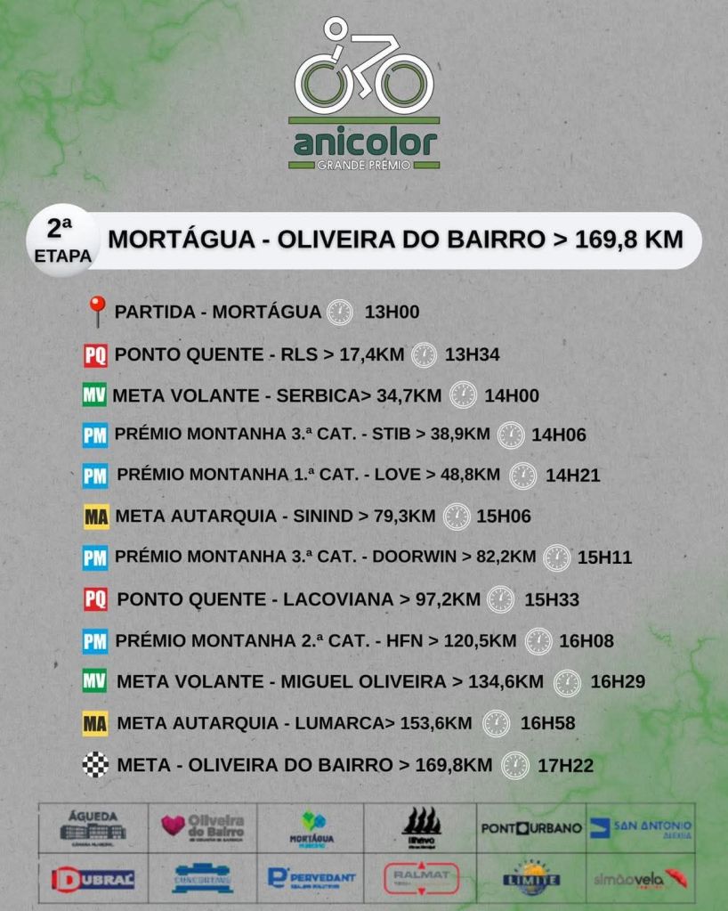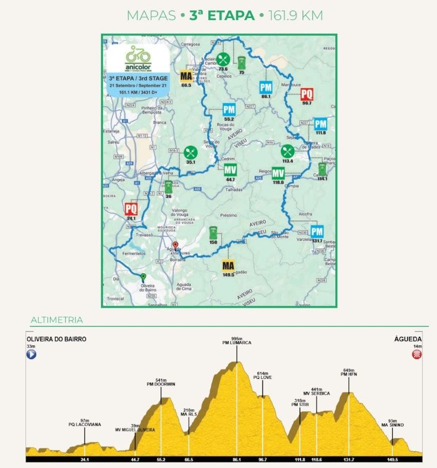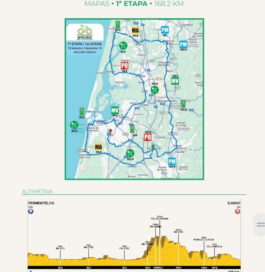 Tras una primera etapa de 168,2 kilómetros sin grandes dificultades, entre Fermentelos (14:30) e Ílhavo (18:30), la segunda etapa promete iniciar la lucha por la clasificación general. El recorrido de 170 kilómetros entre Mortágua (13:00) y Oliveira do Bairro (17:30) destaca por un puerto de primera categoría en los primeros 50 kilómetros, antes de que el pelotón afronte dos puertos más, incluyendo uno de segunda categoría. Sin embargo, la etapa reina está reservada para el último día, con salida en Oliveira do Bairro (12:30 p. m.) y llegada en Águeda (16:40 p. m.). La etapa de 161,9 kilómetros incluye cuatro puertos de montaña, incluyendo uno de primera categoría y dos de segunda.