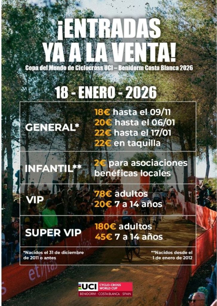 En la edición 2026 de la Copa del Mundo de Ciclocross UCI – Benidorm Costa Blanca habrá tres tipos de entradas para adultos: la General, que costará 18€ hasta el 9 de noviembre; la VIP, con comida, bebida y ubicación privilegiada con vistas a la línea de meta; y la Super VIP, que incluye productos ‘gourmet’ y aparcamiento junto al circuito. Los menores de entre 7 y 14 años pagarán entrada para las zonas VIP y Super VIP, mientras que para todos los menores de 14 años que quieran acceder la zona General y los niños de hasta 7 años que quieran entrar acompañados de un adulto a las zonas VIP y Super VIP se ha habilitado una entrada Infantil de sólo 2€ cuya recaudación será donada íntegramente a asociaciones benéficas de Benidorm y su entorno.