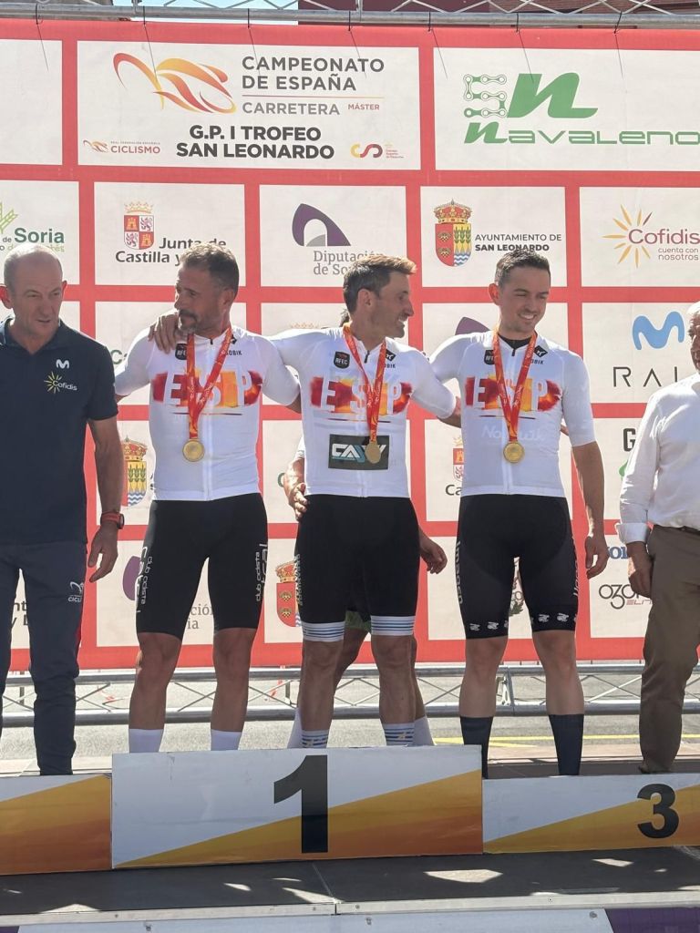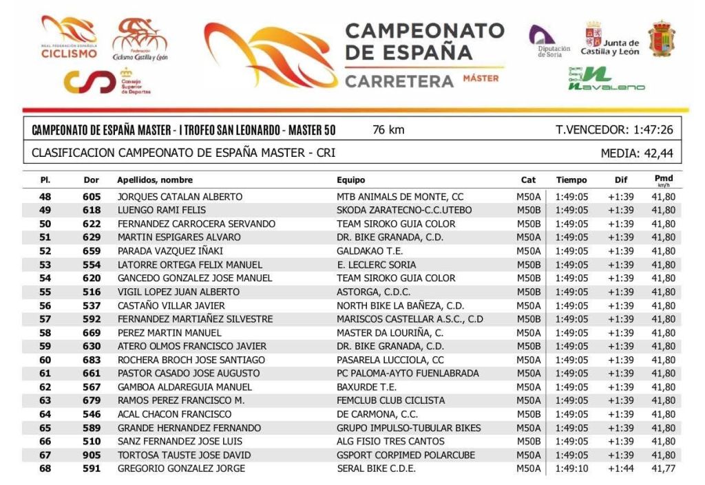 Raúl Patiño (Aluminios Cayvi) y Francisco Antonio Quesada (Catral-Telfy) se han proclamado por carreteras sorianas campeones de España de la categoría Máster 50 masculina en Ruta. Patiño ha sido el mejor en M50A y Quesada (Catral Telfy), en M50B.