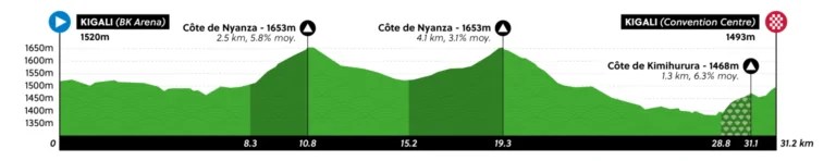Por delante, un recorrido de 31,2 km y 460 metros de desnivel positivo acumulado, con doble subida a la Cote de Nyanza, de 2,5 km al 5,8 de pendiente media, además de con el muro empedrado de la Cote de Kimihurura, de 1,3 km y 6,3% de pendiente media en el tramo final.