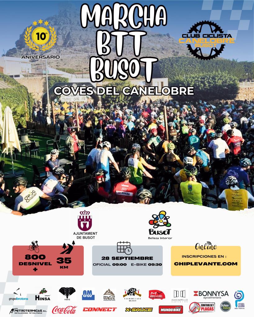 La X Marcha BTT Busot Coves del Canelobre vuelve el 28 de septiembre con un recorrido espectacular de 35 km y 800 m de desnivel entre sendas técnicas, vistas impresionantes y la magia de las Cuevas del Canelobre. La salida será a las nueve de la mañana.