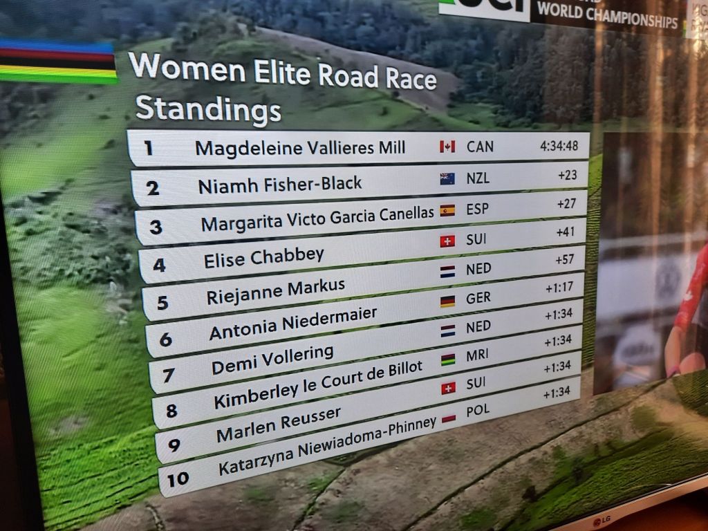 El muro adoquinado de Kimihurura ha sido el encargado de decidir quién portaría el próximo año el arcoíris; y ese premio lo ha conquistado la canadiense Magdeleine Vallieres. Por detrás, Fisher-Black y Mavi García han mantenido un bonito pulso por la segunda posición, separadas por apenas cinco segundos, al tiempo que vigilaban a Elise Chabbey, que había arrancado desde atrás. Finalmente, Fisher-Black se ha llevado la plata y Mavi García un bronce que redondea una preciosa historia como ciclista profesional.