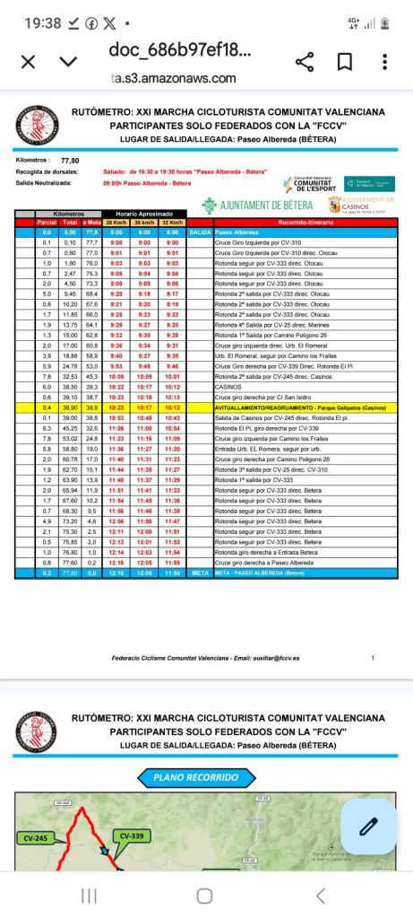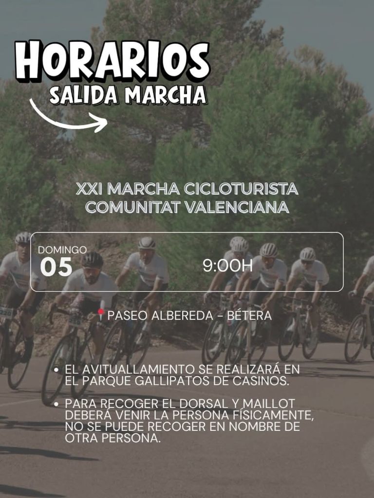 La salida tendrá lugar a las 9:00h desde el paseo de la Albereda de Bétera, localidad que también acogerá la llegada de la marcha. El recorrido contará con 78 kilómetros de distancia dirección hacia Casinos, donde se realizará el avituallamiento en el parque Gallipatos. Allí tendrá lugar un reagrupamiento antes de regresar a Bétera por el mismo itinerario.