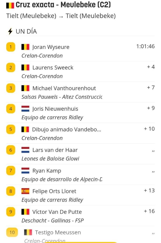 Joran Wyseure (Crelan-Corendon) ganó el primer gran evento de ciclocross de la nueva temporada. En el Exact Cross Meulebeke, el corredor de Crelan-Corendon venció a su compañero Laurens Sweeck y a Michael Vanthourenhout (Pauwels) . Octava plaza de Felipe Orts (Ridley Racing Team) en una prueba que jugó a ser ambicioso.