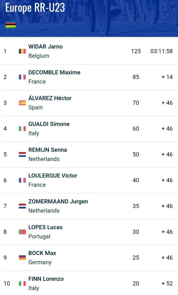 La última ascensión a Val d’Enfer fue clave para la victoria final. El belga Jarno Widar, a la postre vencedor, se marchó junto con el galo Maxime Decomble, para disputarse la victoria. Por detrás, Héctor Álvarez aguantó los envites en las rampas más duras y esperó hasta el sprint, donde volvió a demostrar, no sin un pequeño susto, su velocidad en este tipo de llegadas para darle a España una medalla de bronce, la cuarta en estos europeos. Un nuevo premio para el alicantino, que ya consiguió una medalla de plata el año pasado en Limburgo en categoría júnior, y este año, en su primera temporada como sub23, ya ha subido al podio en el Europeo tras ser cuarto en el Mundial de Ruanda.