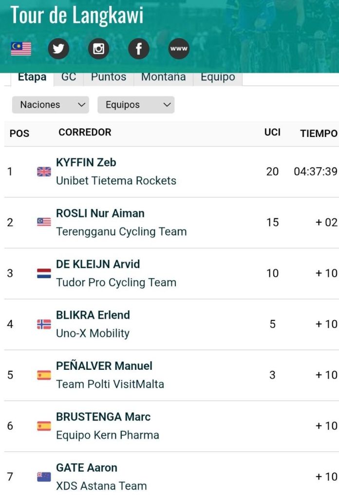 Zeb Kyffin (Unibet) ganó la etapa penúltima en el Tour de Langkawi. Nur Alman Rosli ha sido segundo y Arvid de Kleijn (Tudor). Quinta plaza de Manuel Peñalver (Polti). Delbove sigue de líder.