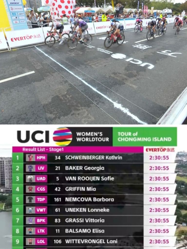El esprint de la primera etapa del Tour of Chongming Island 2025, penúltima cita de la temporada en el UCI Women’s WorldTour, deparó la victoria de la australiana Georgia Baker (Liv-AlUla-Jayco) después de que Kathrin Schweinberger (Human Powered Health) fuese relegada por maniobra irregular en el esprint. Sofie van Rooijen (UAE Team ADQ) y Mia Griffin (Roland) completaron el podio. Ainara Albert (Eneicat) y Alba Teruel (LABORALKutxaTeam) han entrado con las mejores.