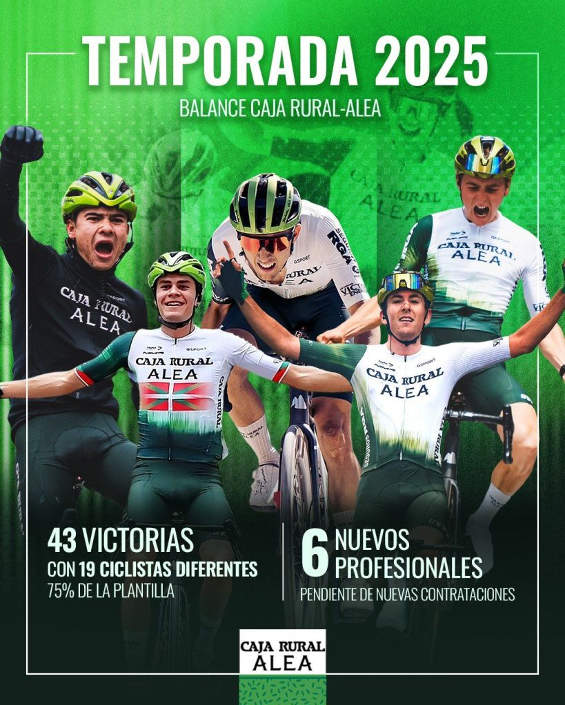 Pasan los años y el conjunto de formación y desarrollo de Caja Rural-Seguros RGA sigue alcanzando las principales metas fijadas al inicio de cada curso deportivo. Un 2025 sobresaliente, en el que se han superado las cuarenta victorias a lo largo de estos meses y en el que ya se ha dado la alternativa a seis nuevos corredores, cuatro de ellos destino al primer equipo.