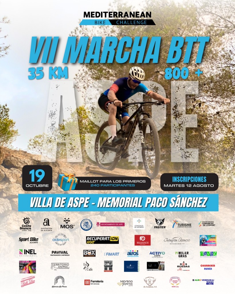 El domingo, 19 de octubre, se disputa, a partir de las 9.30 horas, la VII Marcha BTT ASPE 2025-Memorial Paco Sánchez, segunda prueba de la Mediterranean Bike Challenge que lideran Jorge Martín (Ciclos Sabater) y Elena Lloret (Cap Negret) ganadores de de la Marcha BTT Sierra de Biar con el que se inicio el Torneo. Consta de 35 kilómetros de recorrido y un desnivelde 800 metros.