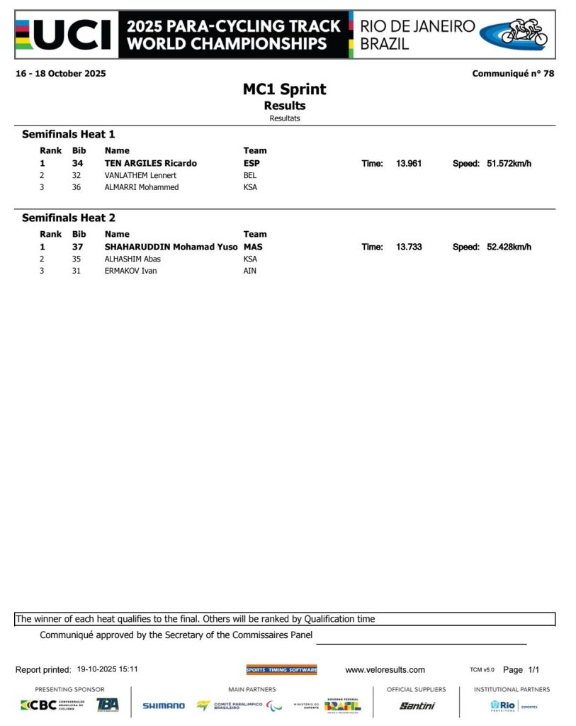 Ricardo Ten se marcha de Río de Janeiro como uno de los grandes protagonistas del Mundial tras conseguir tres arcoíris a los que hoy ha añadido una medalla de plata. El ciclista de la Selección Española fue el mejor en los 200 m CRI con un crono de 12”249 y posteriormente ganó su manga de primera ronda para ganarse el derecho a disputar el oro con el malayo Mohamad Shaharuddin. En el enfrentamiento por el arcoíris, Shaharuddin ha sido más rápido y Ten ha tenido que conformarse con la medalla de plata.