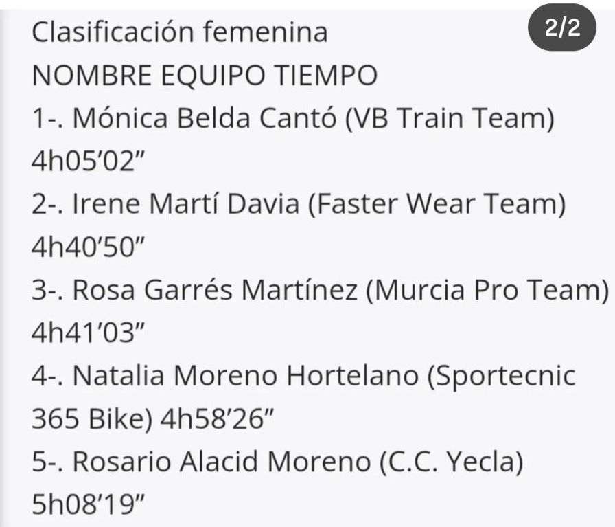 En la categoría femenina no hubo lucha por la victoria, pues Mónica Belda hizo gala de su condición de favorita para lograr un triunfo sin paliativos. La corredora del VB Train Team llegó a meta con más de media hora de ventaja, una renta que demuestra su superioridad. Sí que hubo emoción en la lucha por el segundo y tercer cajón del pódium, pues poco más de diez segundos separaron en meta a Irene Martí Davia y Rosa Garrés Martínez. Natalia Moreno Hortelano fue cuarta, mientras que la líder del Circuito Provincial, Rosario Alacid Moreno, cruzó la meta en la quinta posición a más de una hora de la vencedora.