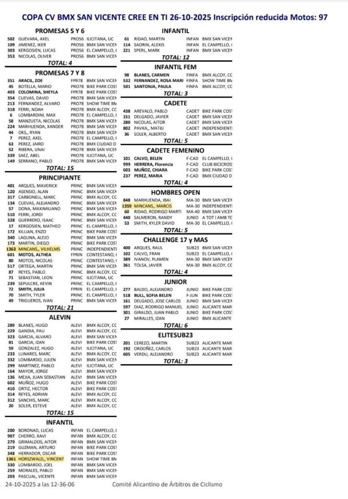 La Concejalía de Deportes junto al Club BMX San Vicente organizan el domingo, 26 de octubre, la sexta prueba de la Copa CV BMX el Trofeo SAN VICENTE CREE EN TI 2025. Cuenta con 97 participantes.