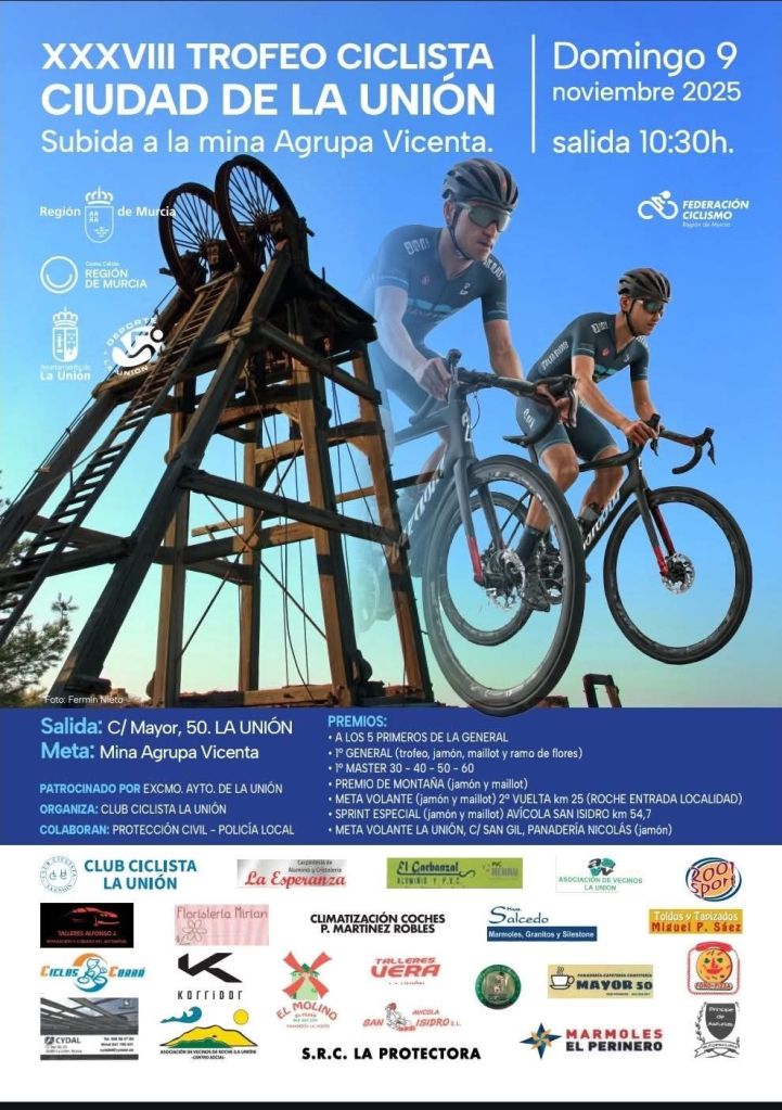 El domingo, 9 de noviembre, a partir de las 10.30 horas, se disputa el XXXVIII Trofeo Ciclista Ciudad de La Unión, penúltima prueba puntuable de la Copa Otoño Región de Murcia que lidera Alejandro Gomiz.