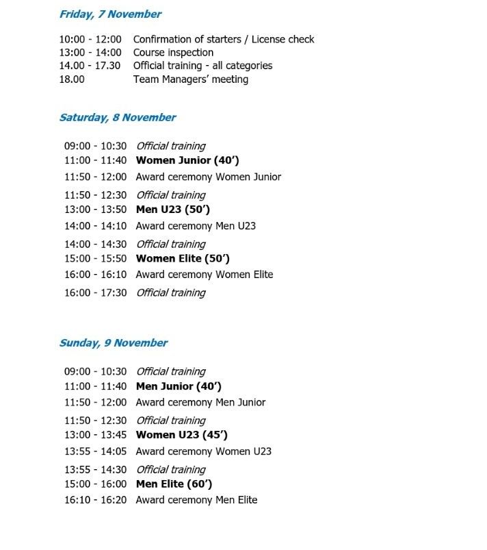 El programa de carreras se concentrará entre el sábado y el domingo. El sábado 8 de noviembre la competición arrancará con las chicas júnior a las 11:00 h. Seguidamente, a las 13:00 h. tomarán la salida los hombres Sub-23 y la jornada finalizará con la prueba de las mujeres élite a las 15:00 h.