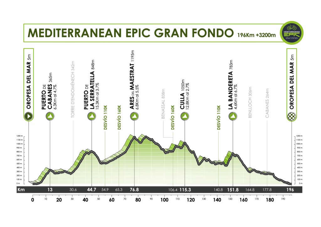 La Mediterranean Epic Gran Fondo propone tres recorridos: 110, 160 y 196 kilómetros. En su versión más exigente y que solo los más valientes experimentarán, el desnivel acumulado alcanza los 3.200 metros. El trazado combina el encanto del litoral mediterráneo con la dureza de los puertos del interior de Castellón. En definitiva, la Mediterranean Epic Gran Fondo cuenta una ruta diseñada para disfrutar y sufrir a partes iguales.