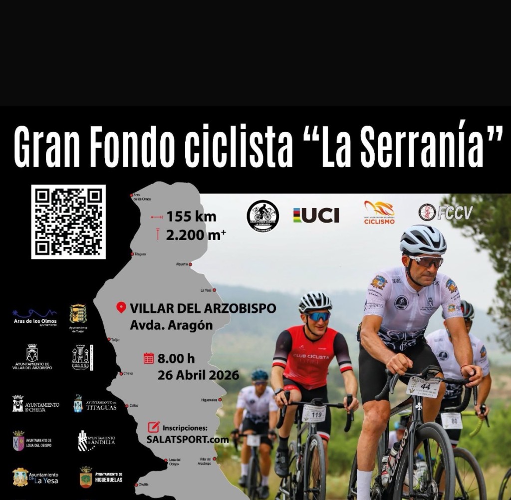 El III GRAN FONDO LA SERRANÍA abre sus inscripciones el viernes, 7 de de noviembre. La marcha cicloturista se celebrá el domingo 26 de abril 2026 con una distancia de 155 km y 2200m+. La salida y llegada será desde la Avenida diputación, en Villar del Arzobispo. La distancia CORTA cuenta con de 87 km y 1425m+. La salida será desde Losa del Obispo y llegada será desde la Avenida diputación, en Villar del Arzobispo.